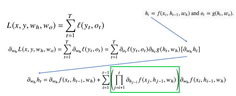 - RNN의 역전파는 잠재변수의 연결그래프에 따라 순차적으로 계산 (Backpropagation Through Time, BPTT)