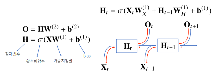 - 잠재변수 \(H_t\)를 신경망을 통해 반복해서 사용하여 시퀀스 데이터의 패턴을 학습하는 모델을 RNN