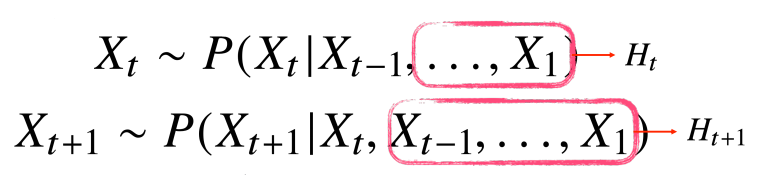 - 이전 시퀀스의 정보를 가지고 앞으로 발생할 데이터의 확률분포를 다루기 위해 조건부확률 이용