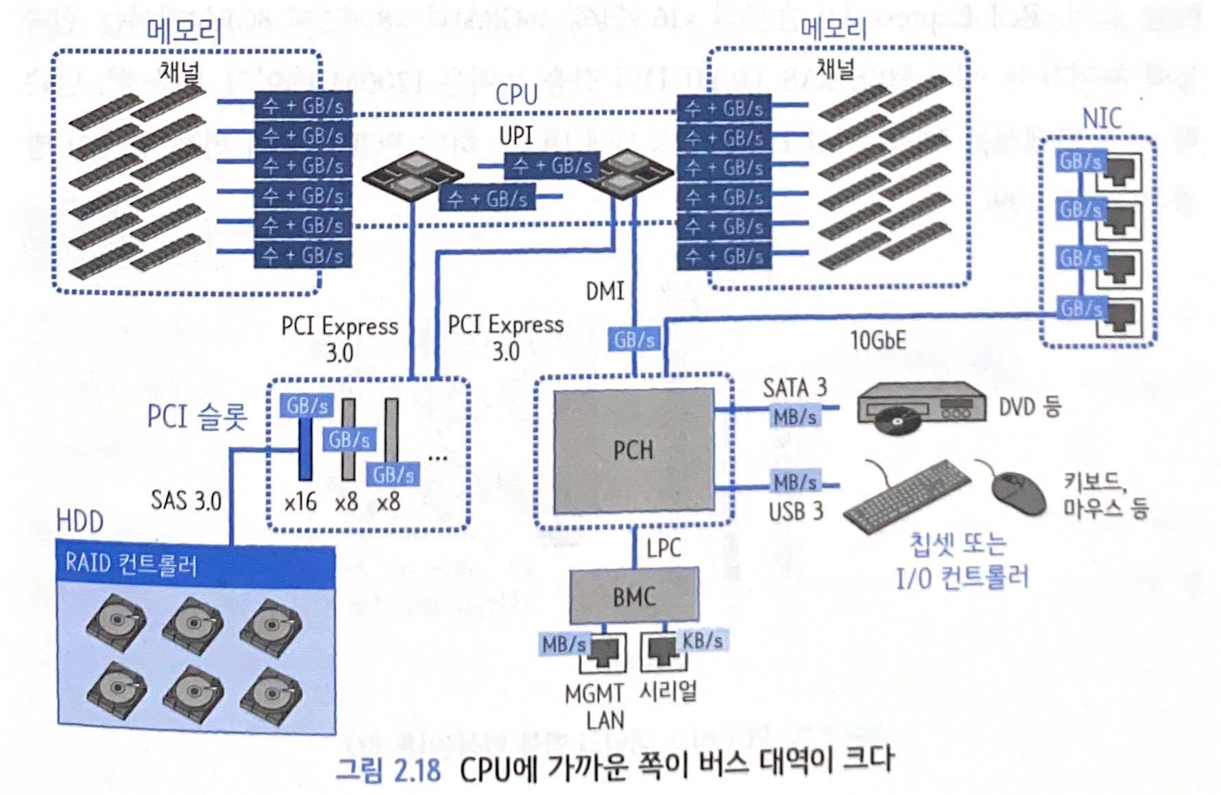 - 버스 흐름에서 중요한 것은 CPU와 장치 사이에 병목 현상(데이터 전송이 어떤 이유로 막혀 있는 상태, Bottleneck)이 없어야 한다는 것