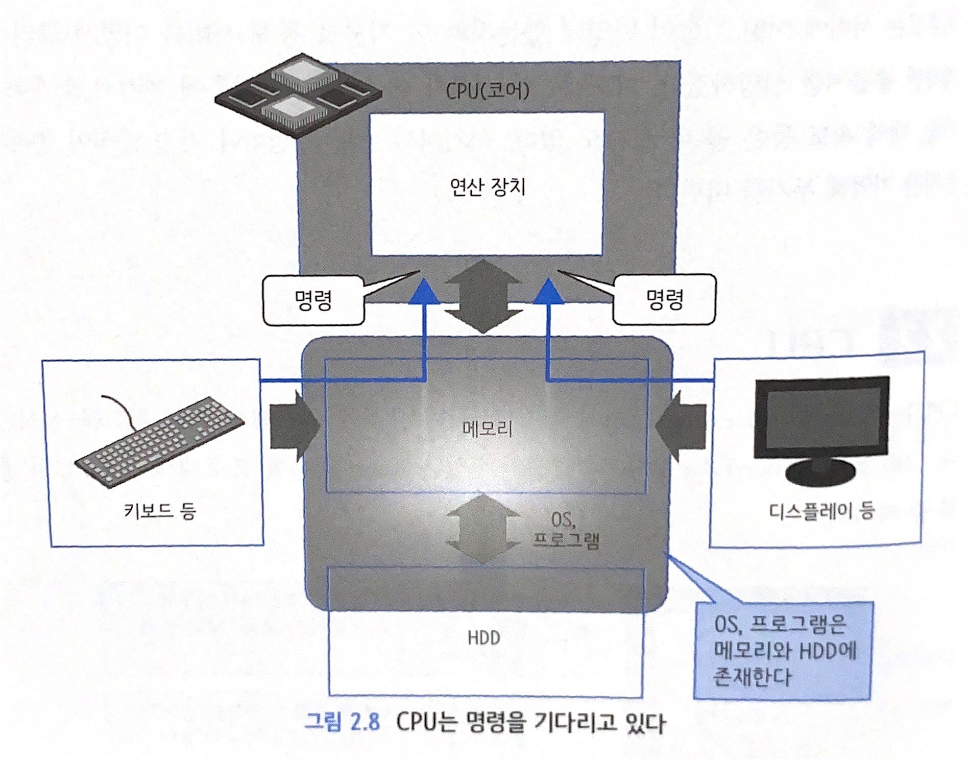 - CPU는 명령을 받아서 연산을 실행하고 결과를 반환하고, 명령과 데이터는 기억 장치나 입출력 장치를 통해 전달됨
