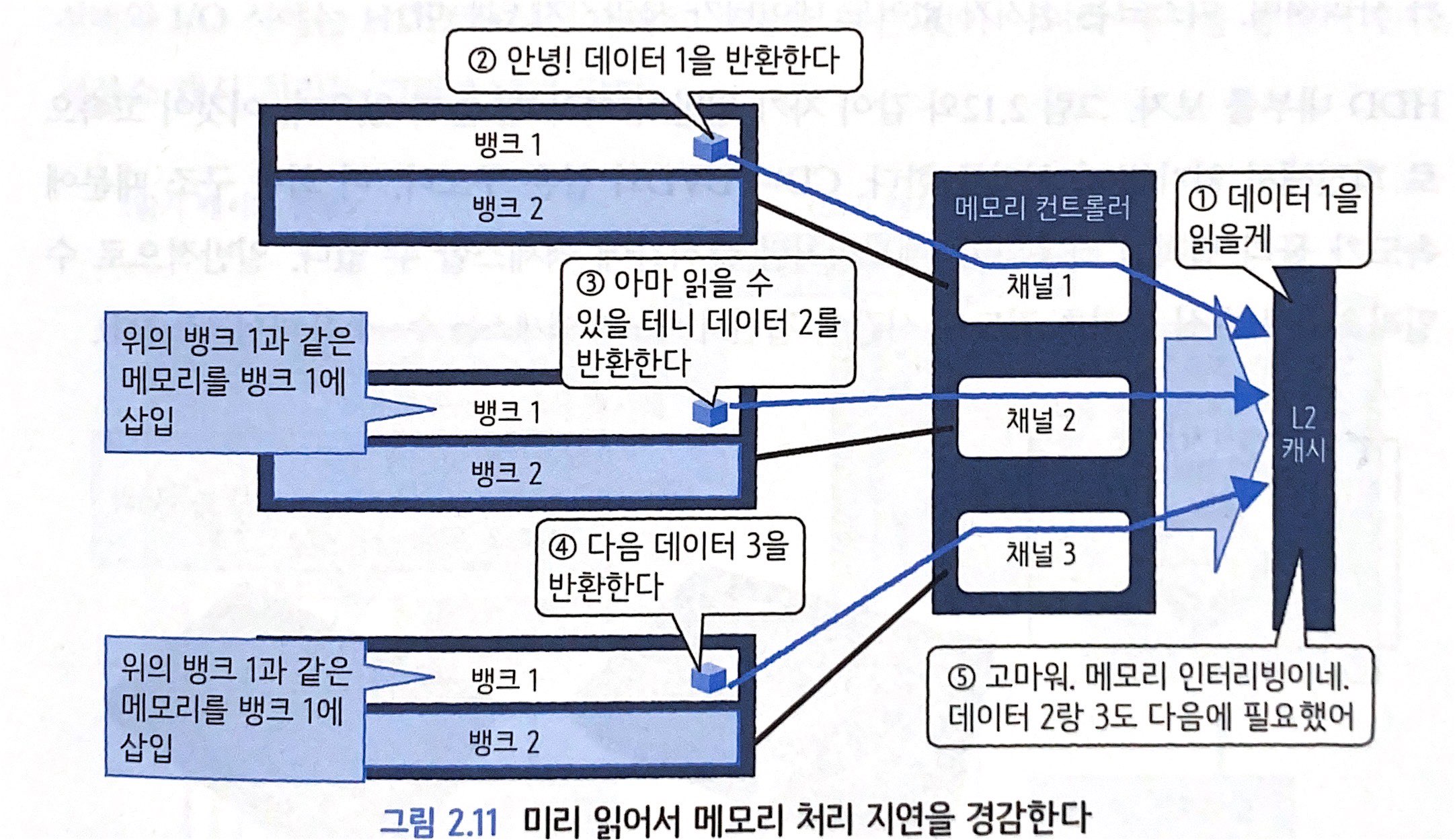 - 미리 데이터를 CPU에 전달해서 처리 지연을 줄이는 메모리의 '메모리 인터리빙(Memory Interleaving)'