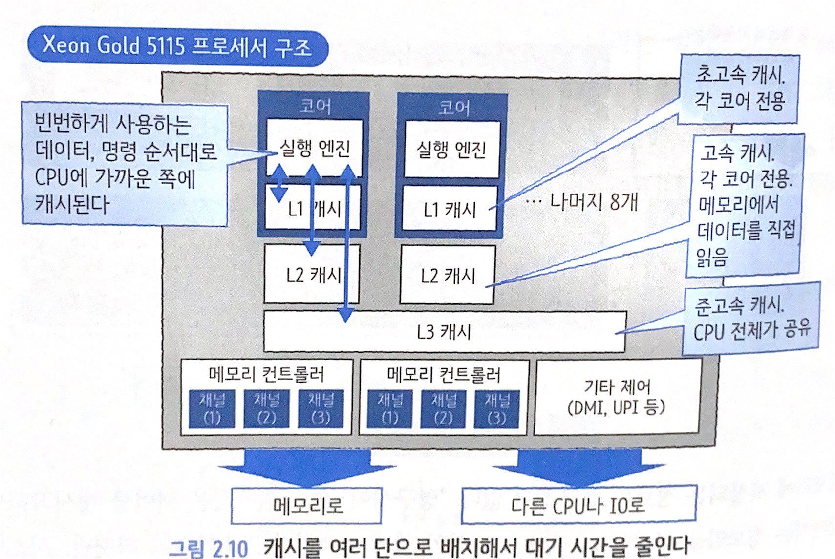 - CPU 자체에도 레지스터, 1차(L1)/2차(L2) 캐시라는 메모리 존재. 일반 메모리보다 더 빠르지만 용량이 작음