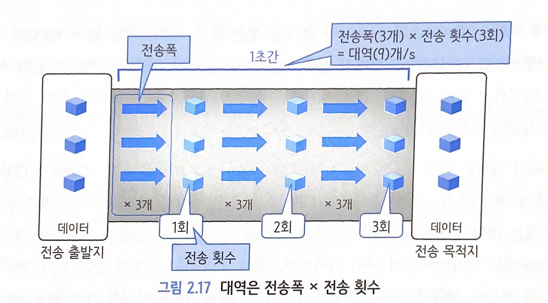 - 대역은 데이터 전송 능력을 의미. 한 번에 보낼 수 있는 데이터의 폭(전송폭) X 1초에 전송할 수 있는 횟수(전송 횟수)