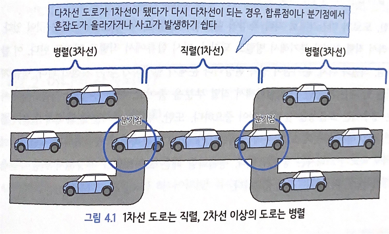- 예를 들어, 3차선 도로가 1차선이 되는 부분과 같다. 3차선으로 나누어 운행하던 자동차가 1차선으로 집약되기 때문에 한 대의 자동차가 통과할 때는 다른 차선의 자동차가 들어오지 않도록 배타적 제어를 한다. 이런 부분에서는 병목 현상이 발생하기 쉬움