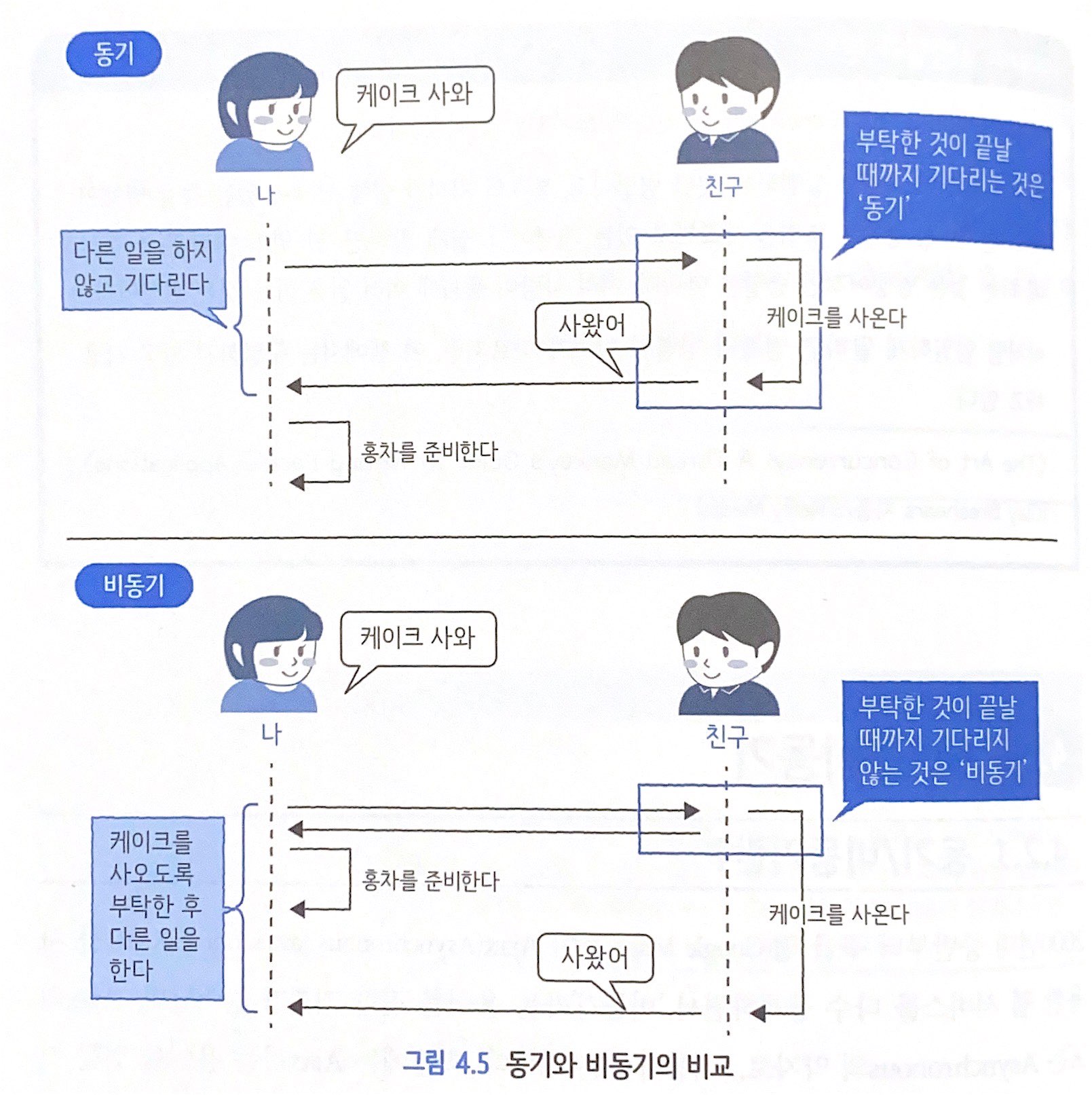 - 비동기는 '끝나면 말해'라고 말해 두고 다른 일을 하는 것. 비동기에서는 처리를 병행해서 진행 가능