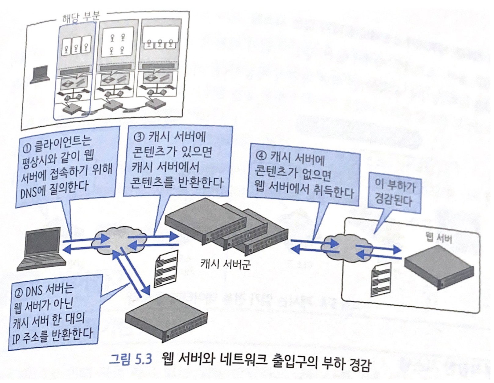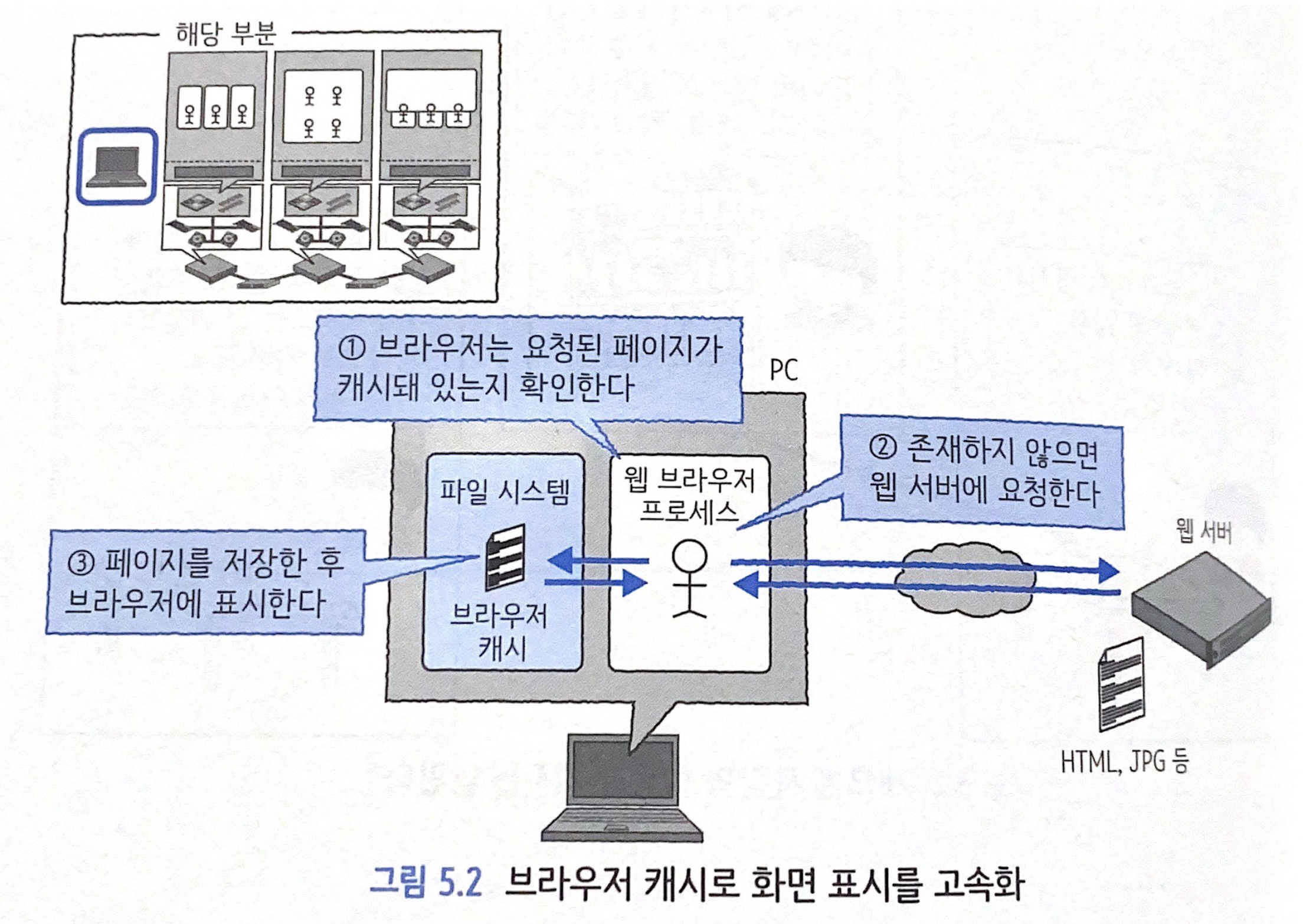 - 아래 그림의 브라우저 캐시는 웹 브라우저가 접속한 페이지를 캐시하는 것. 이를 통해 웹 서버 접속을 줄이고 브라우저 표시 고속화 가능