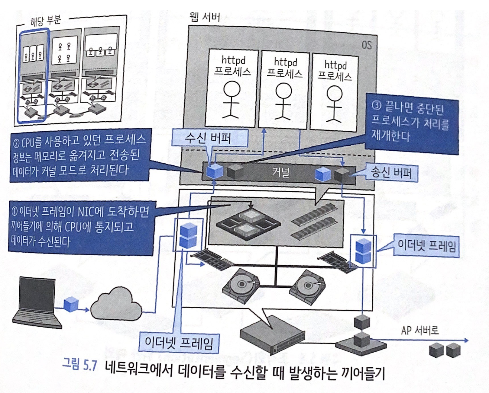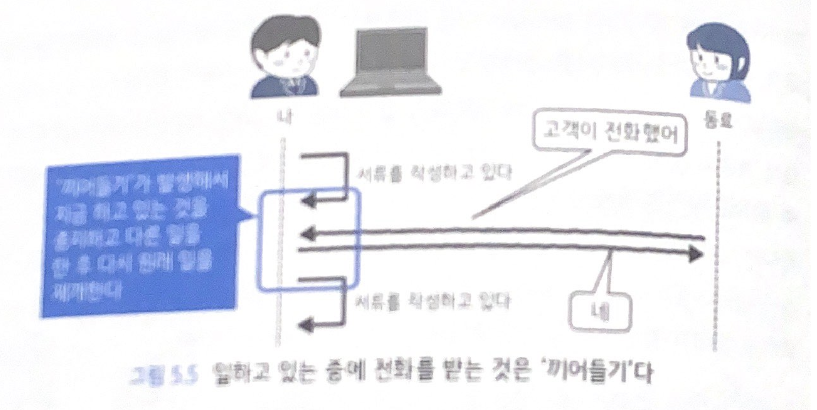 - CPU에서 애플리케이션 프로세스나 스레드 처리를 하고 있더라도 키보드로 정보가 입력되면 끼어들기가 발생해서 CPU가 짧은 순간 다른 처리를 한 후 다시 원래 처리를 진행