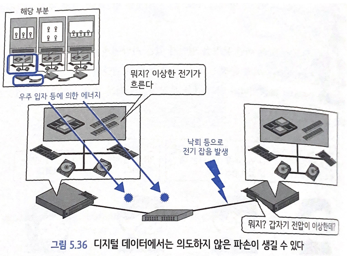 - 대부분의 통신 방식에서는 전기 신호를 이용해서 데이터를 교환하고 있는데, 경로 도중 낙뢰 등으로 전기적인 잡음 등이 발생하면 데이터 파손될 수 있음