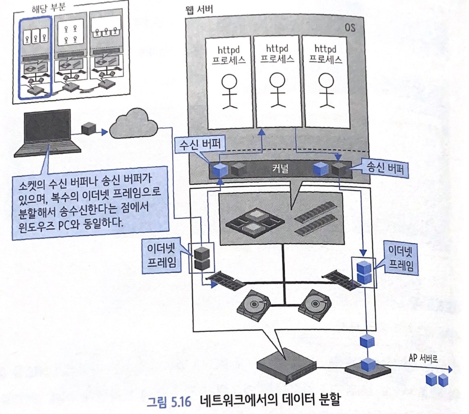 - 웹 브라우저가 송신하는 경우 소켓의 송신 버퍼를 사용하는데, 이 버퍼가 차면 OS에 의해 TCP 세그먼트라는 상자로 분할되고, TCP 헤더, IP 헤더, MAC 헤더라는 편지 수신자 같은 정보를 붙여서 이더넷 프레임이라는 상자에 넣어 전송한다