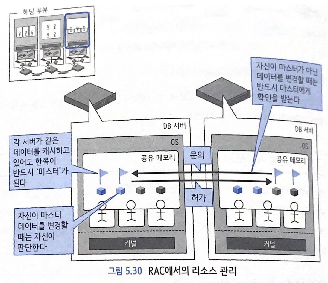 - RAC에서는 여러 대의 물리 서버가 클러스터 구성으로 연결되어 있음. 모두가 대등한 관계이기 때문에 특정 서버가 다운되더라도 데이터베이스 전체 가용성에는 영향을 주지 않음