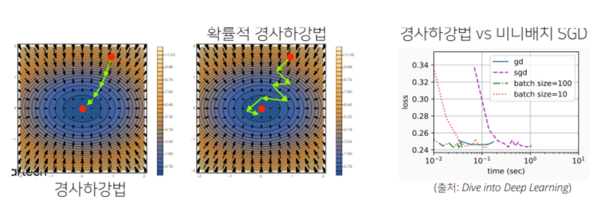 - 모든 데이터를 사용하는 경사하강법과 달리, 확률적 경사하강법은 데이터 한개, 또는 데이터의 일부(mini-batch)를 활용하여 업데이트함