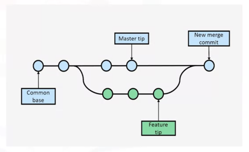 4. When the two streams of work are ready to merge, each branch's code is identified as a tip and the two tips are merged into a third, combined branch