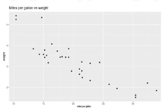 ggplot(mtcars, aes(x=mpg, y=wt))+geom_point() + ggtitle("Miles per gallon vs weight") + labs(y="weight", x="Miles per gallon")