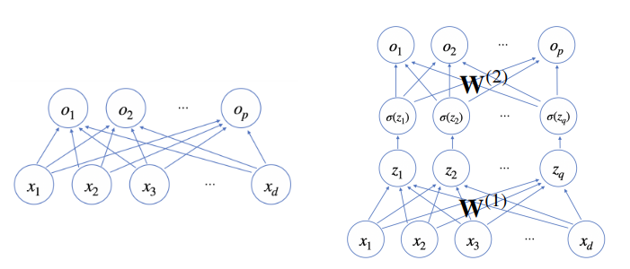 - x와 o를 이어주는 선은 (dxp) 차원의 가중치행렬 W. 이를 통해 출력 벡터의 차원이 바뀜