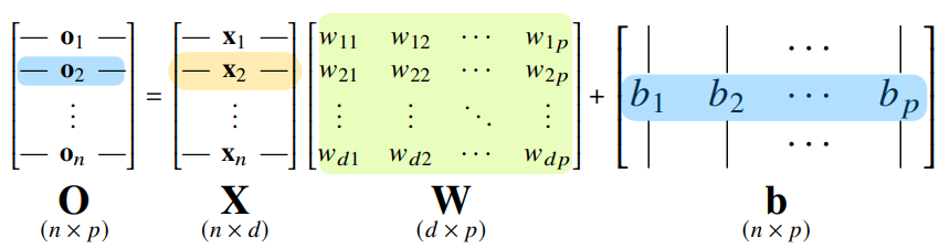 - b : y절편. 각 행들이 전부 같은 값을 가지게 됨. (nxd) x (dxp)으로 출력으로 나오는 값과 같은 차원이어야 함