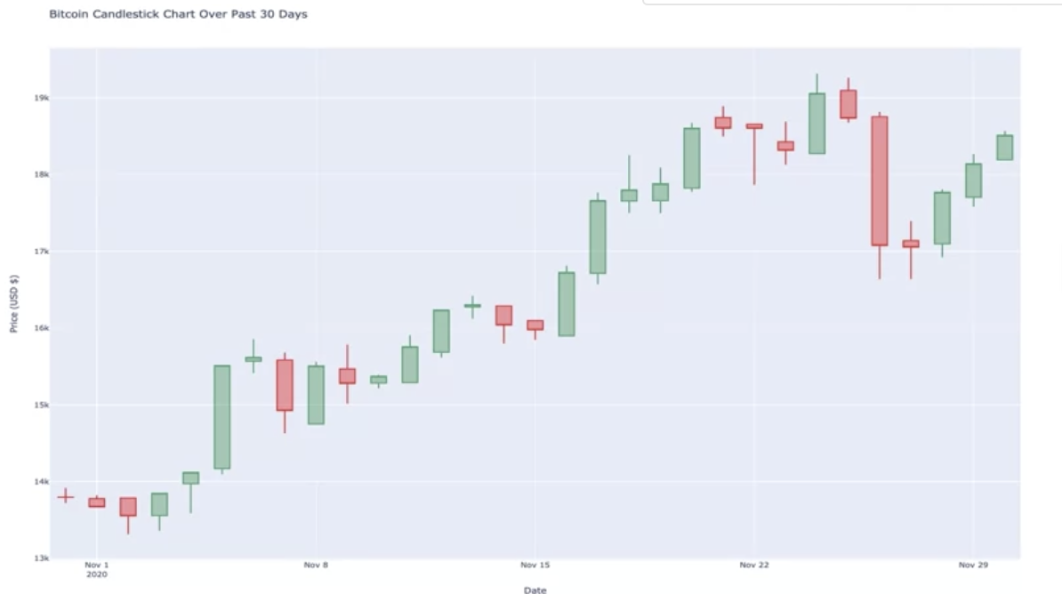yaxis_title='Price (USD $)', title='Bitcoin Candlestick Chart Over Past 30 Days')