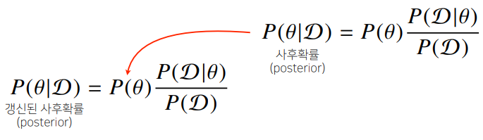 - 베이즈 정리를 통해 새로운 데이터가 들어왔을 때 앞서 계산한 사후확률을 사전확률로 사용하여 갱신된 사후확률을 계산할 수 있음